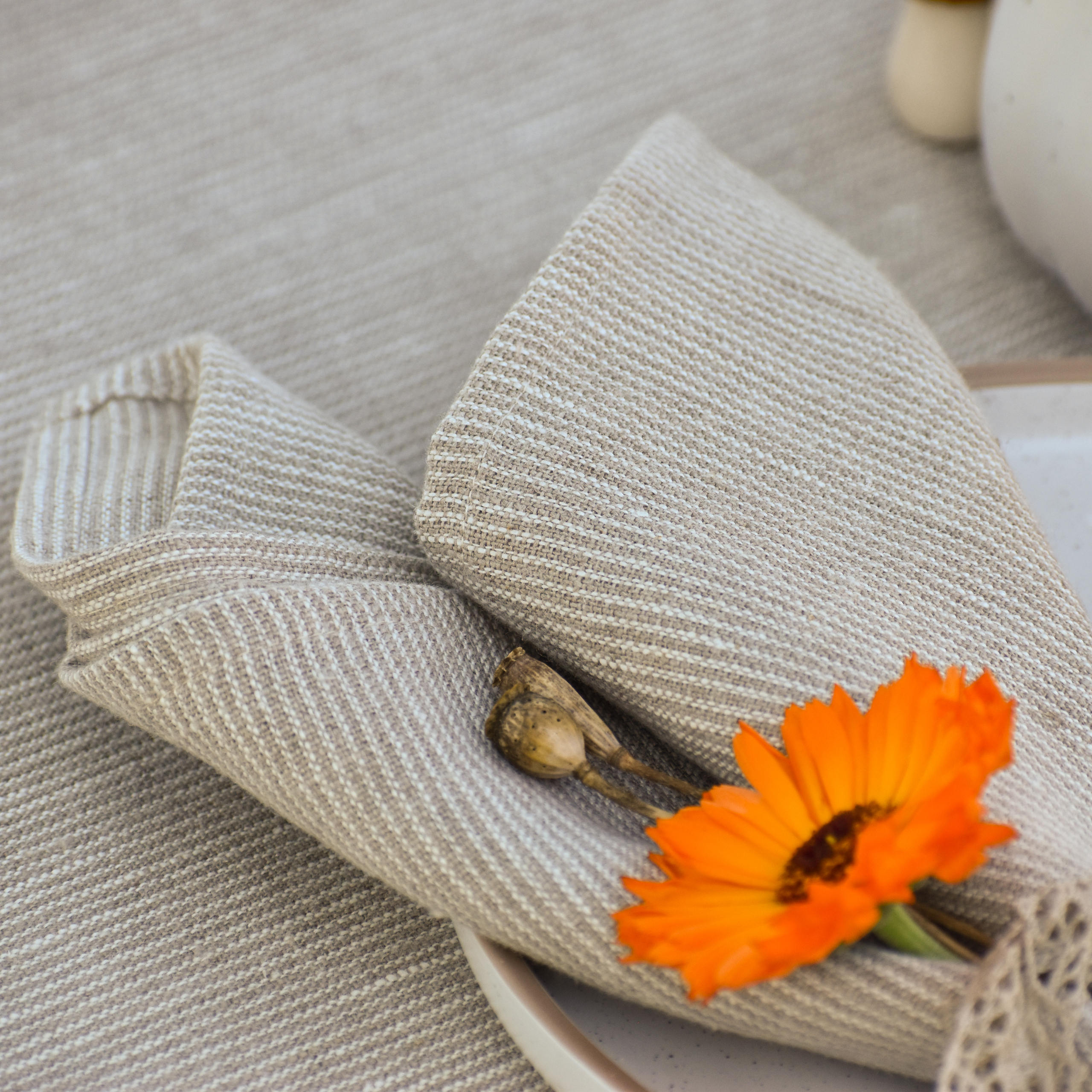 A set of white and natural striped, washed linen napkins, made of high-quality, durable linen fabric, will decorate every table. Linen napkins are reusable, creating a luxurious atmosphere.