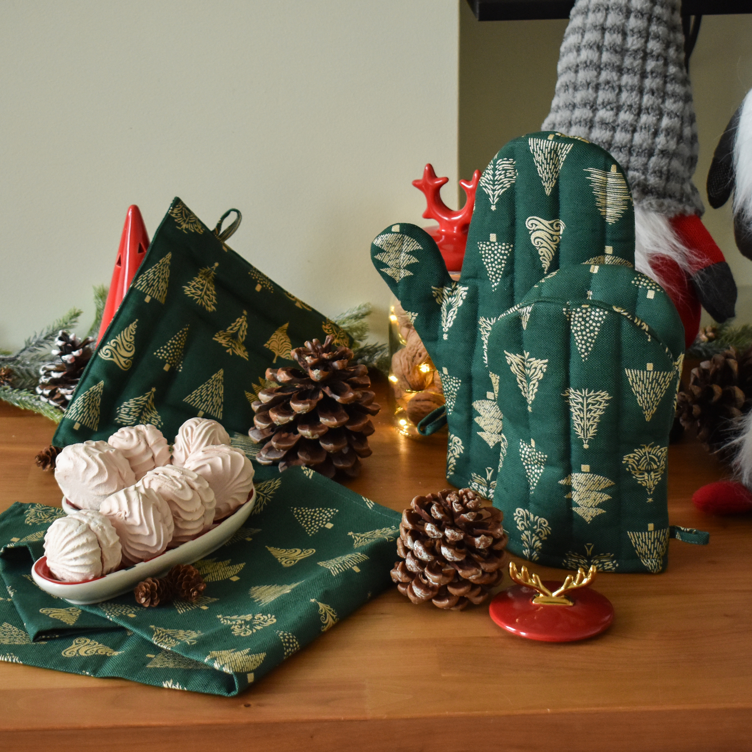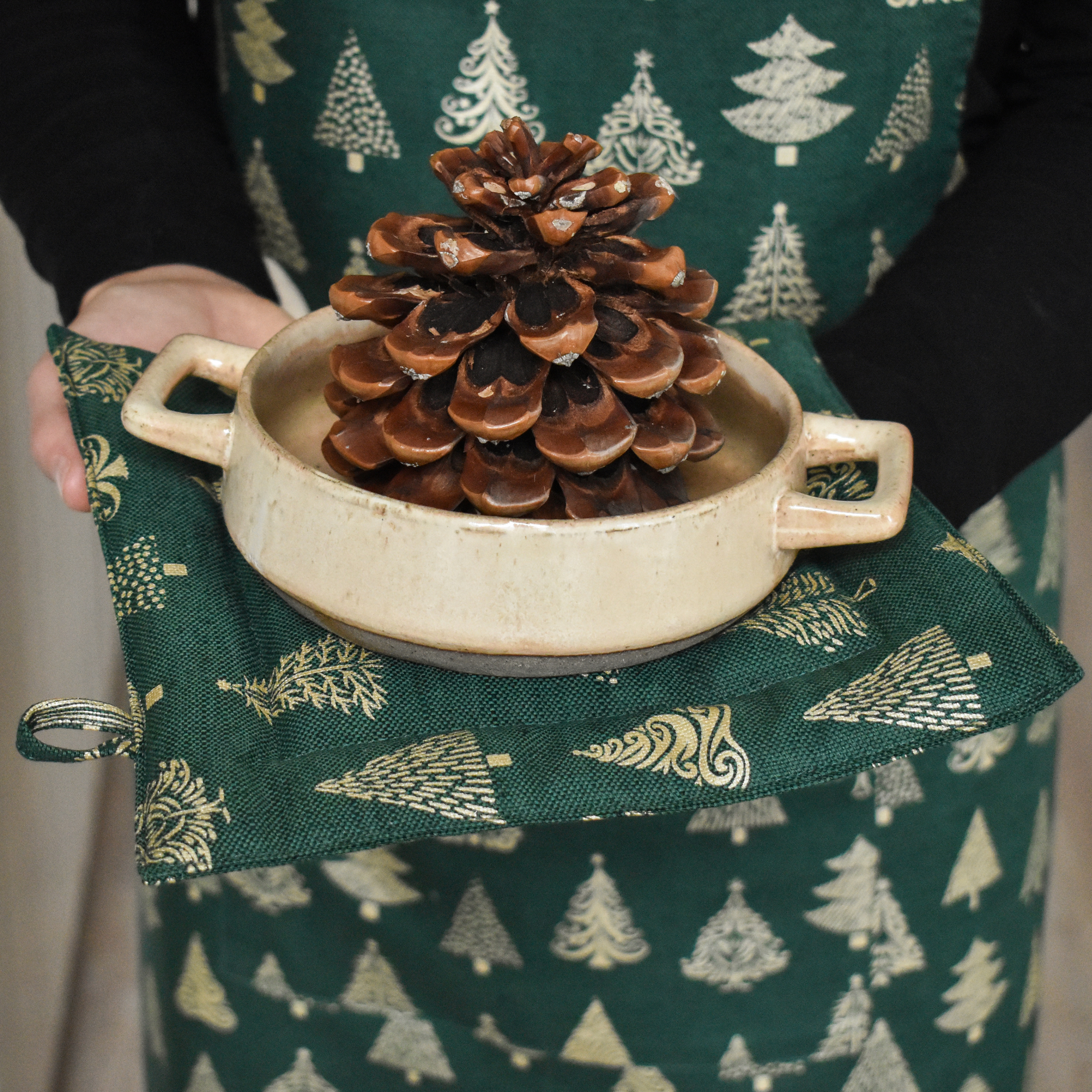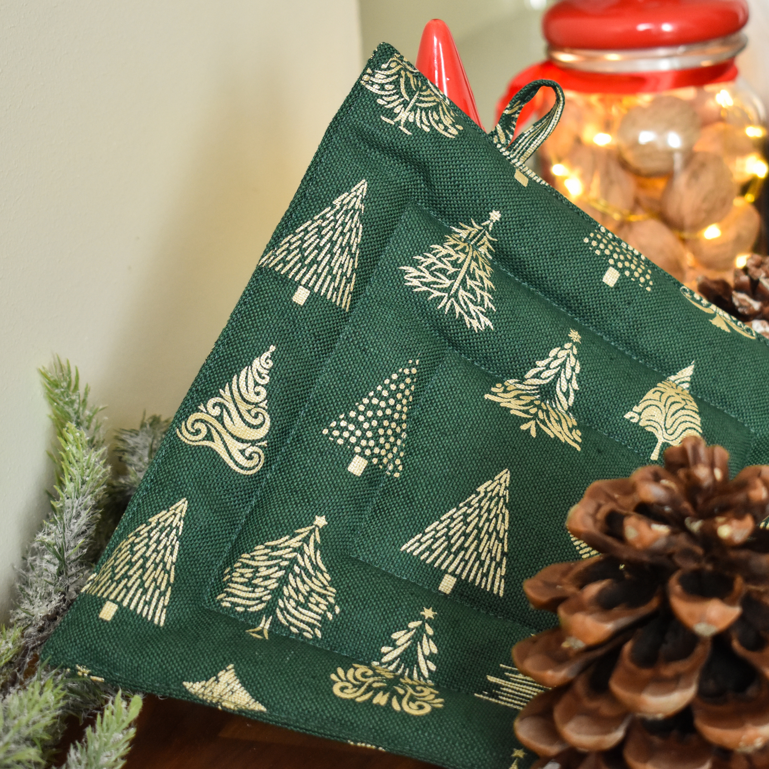 Potholder with Christmas pattern for everyday kitchen use. With an inner layer of non-woven fabric, making it suitable for handling hot dishes or using as a trivet. For easy use, has a sewn loop. Made in Lithuania.