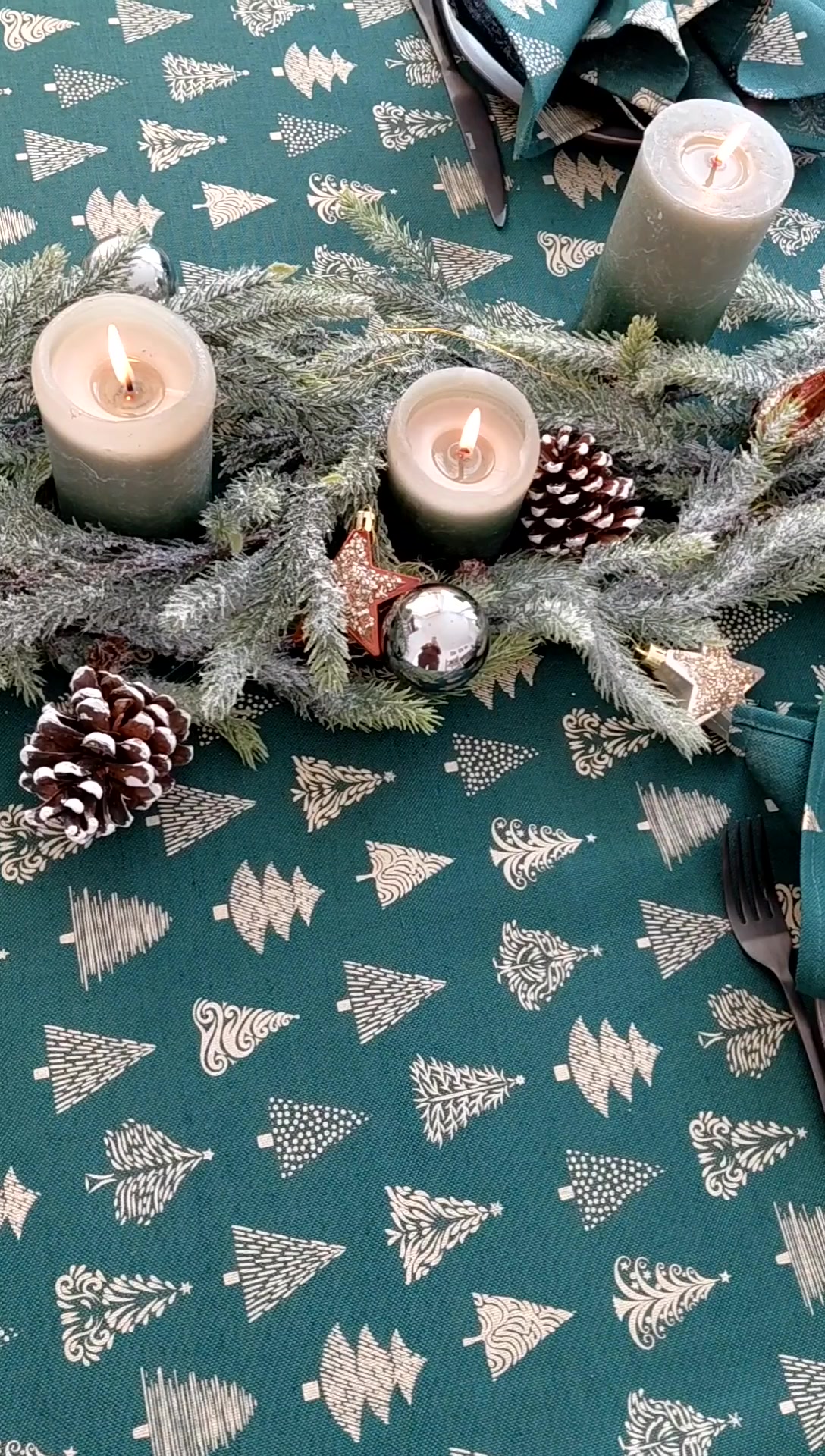 Green colored tablecloth with golden Christmas print will give your home an elegant look and a feeling of coziness, perfect for decorating your dining room during the festive period and creating an upbeat mood.