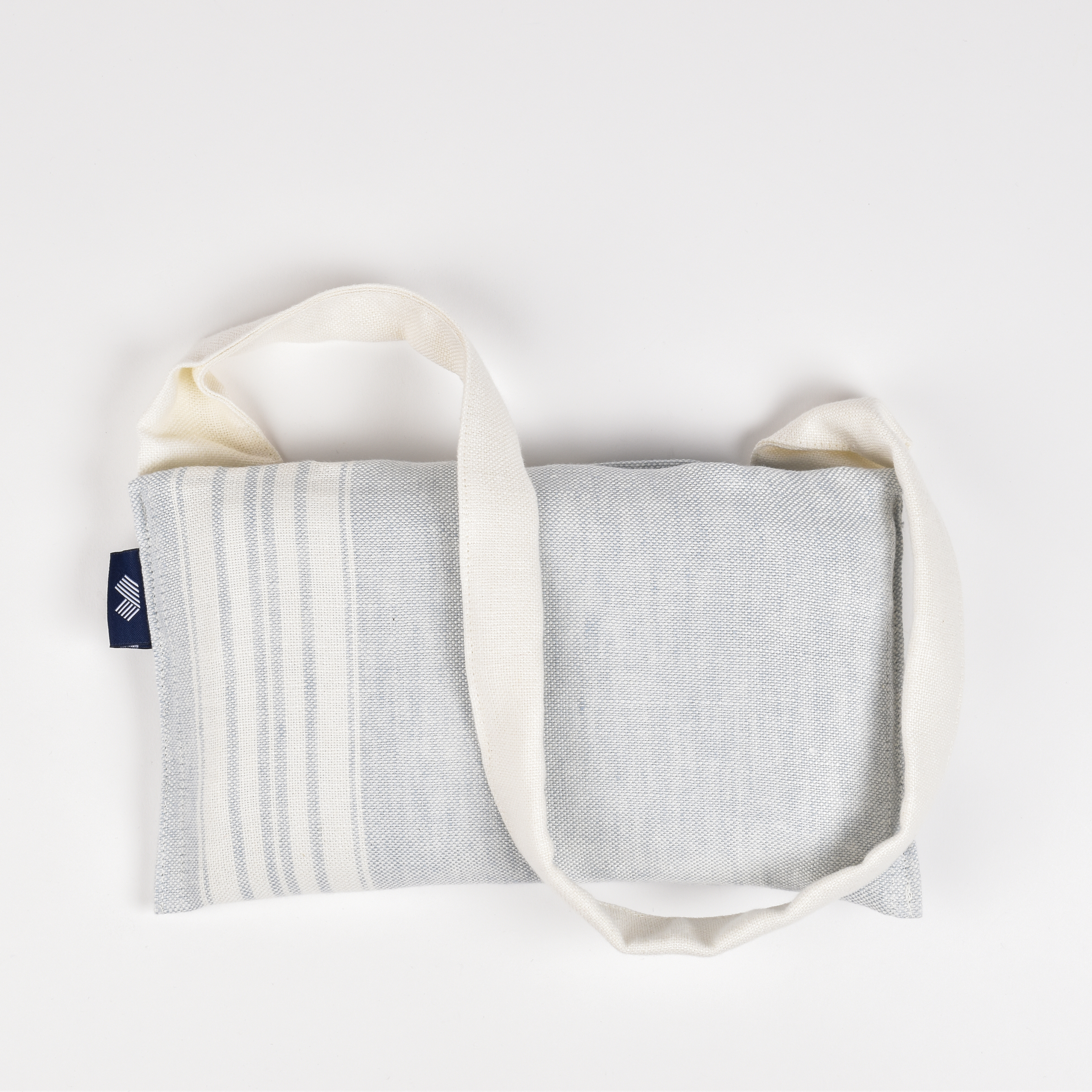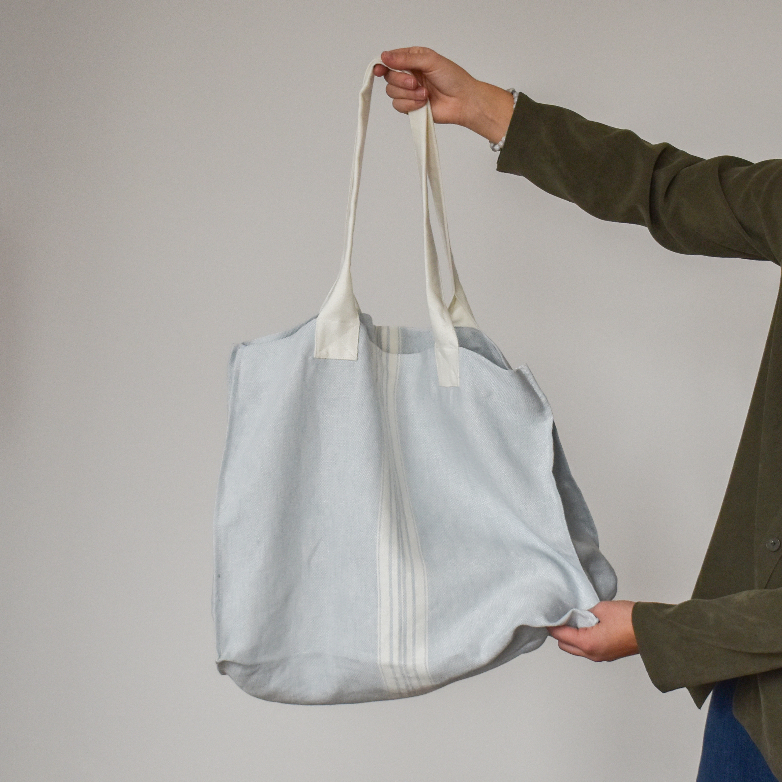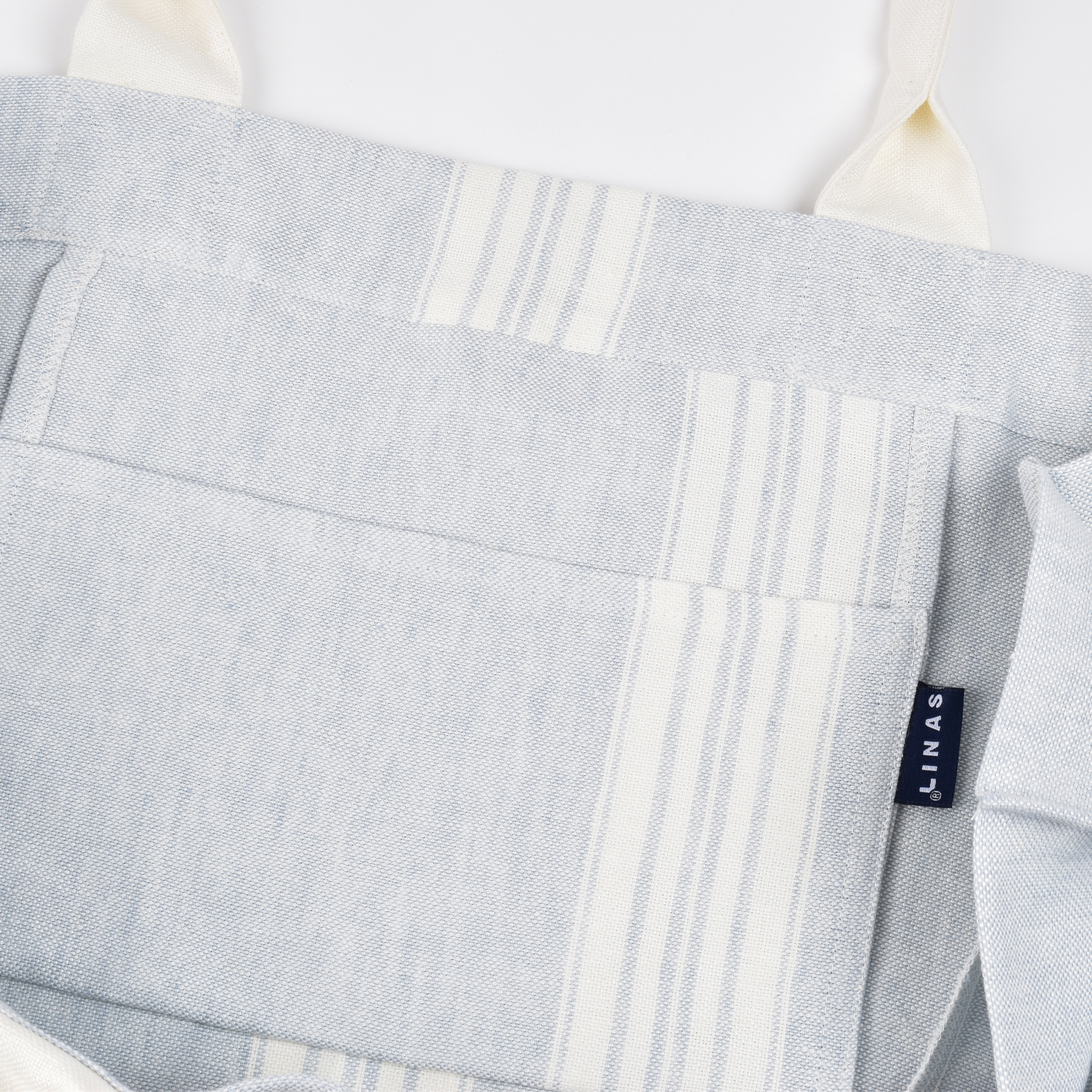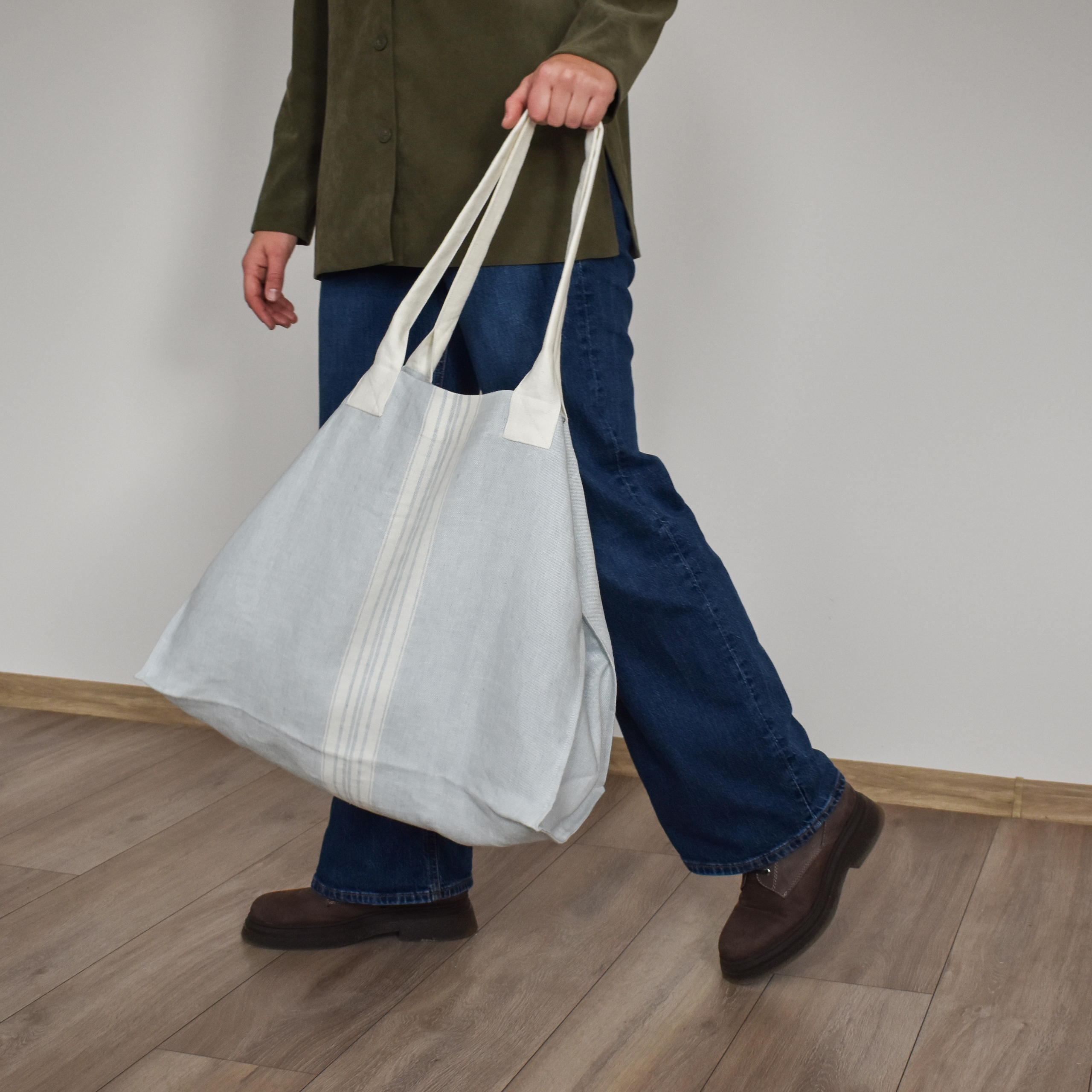 Lininis žydros spalvos sulankstomas pirkinių maišelis