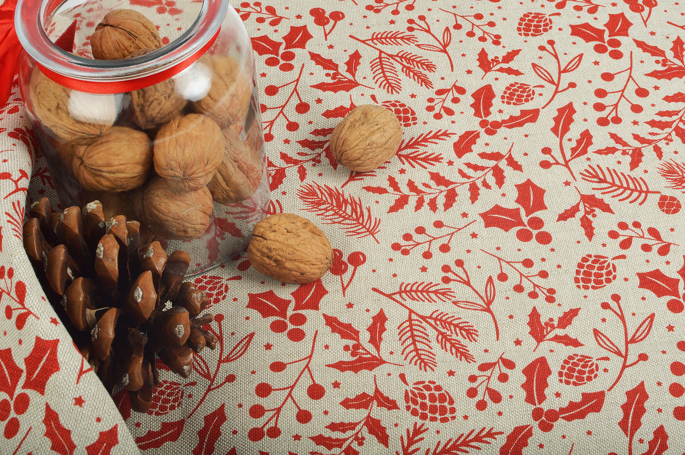 Puslininis audinys, margintas raudonos spalvos stilizuotų Kalėdinių augalų motyvais. Audinys nėra minkštintas, todėl išlaiko natūralų, šiek tiek standesnį paviršių – idealų tekstilei, kuriai svarbi forma ir tvirtumas. Puikiai tinka virtuvės tekstilei, stalo gaminiams, namų dekoracijoms bei aksesuarams, kuriuose derinamas funkcionalumas ir estetinė išraiška.