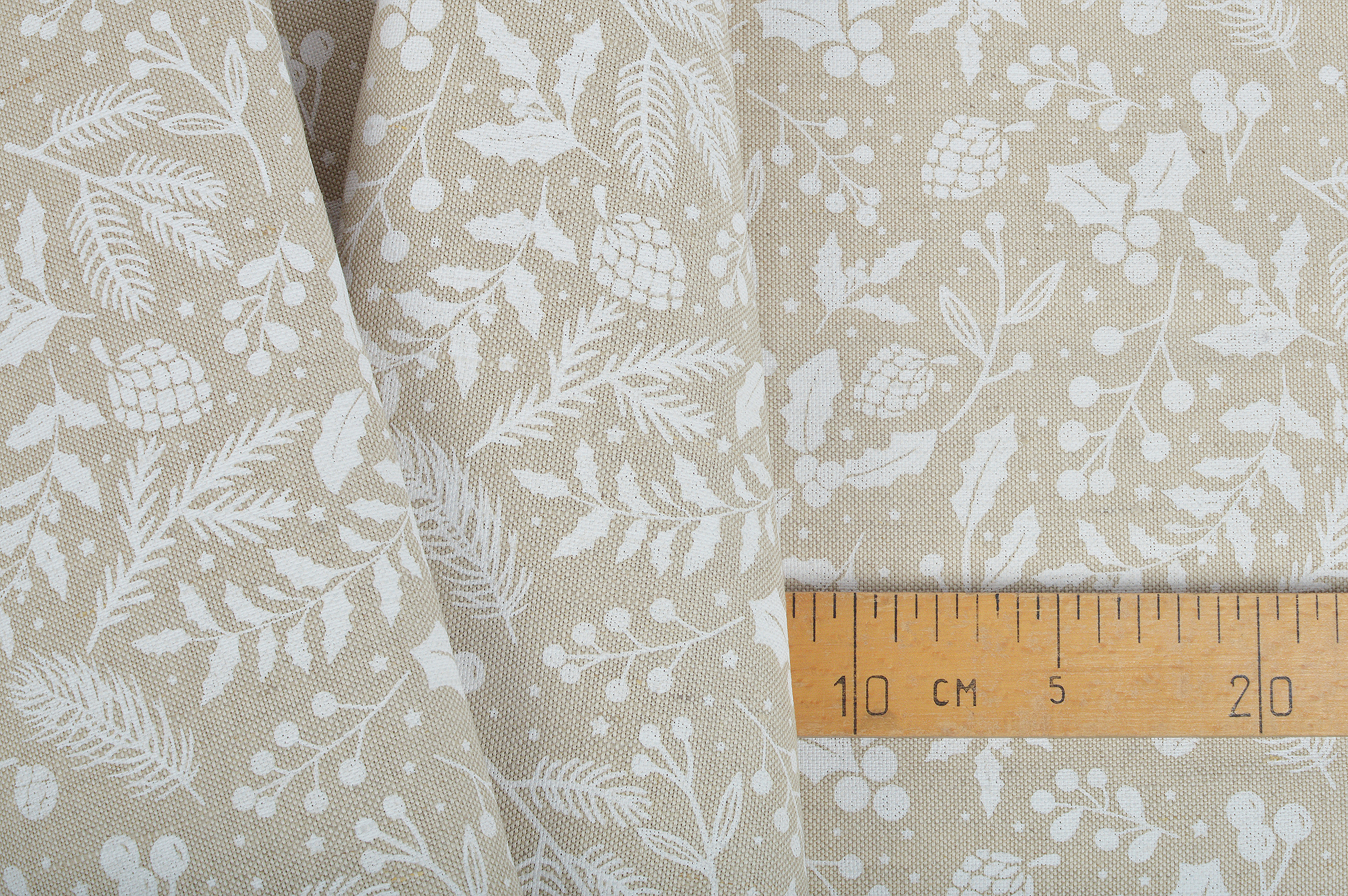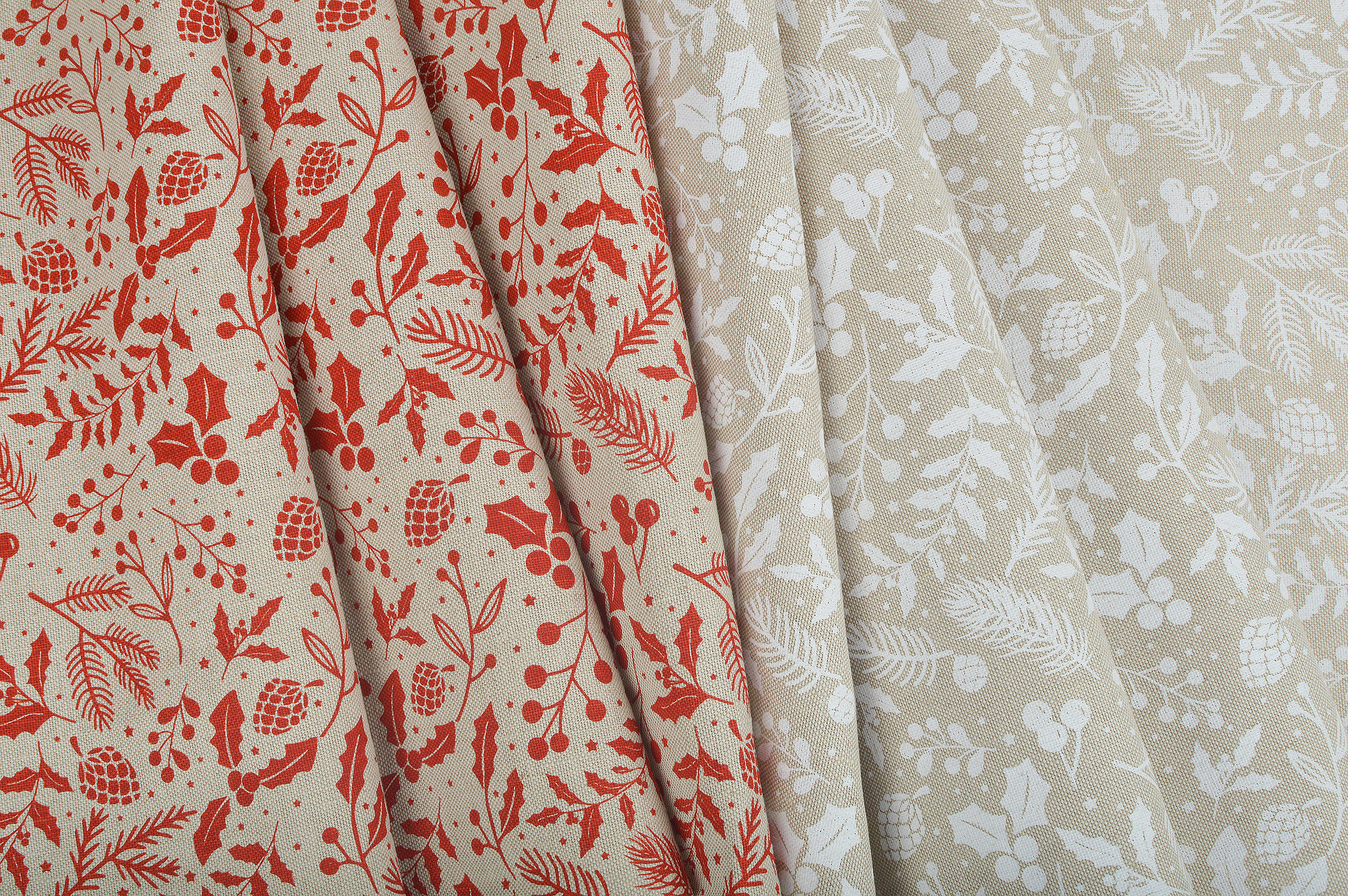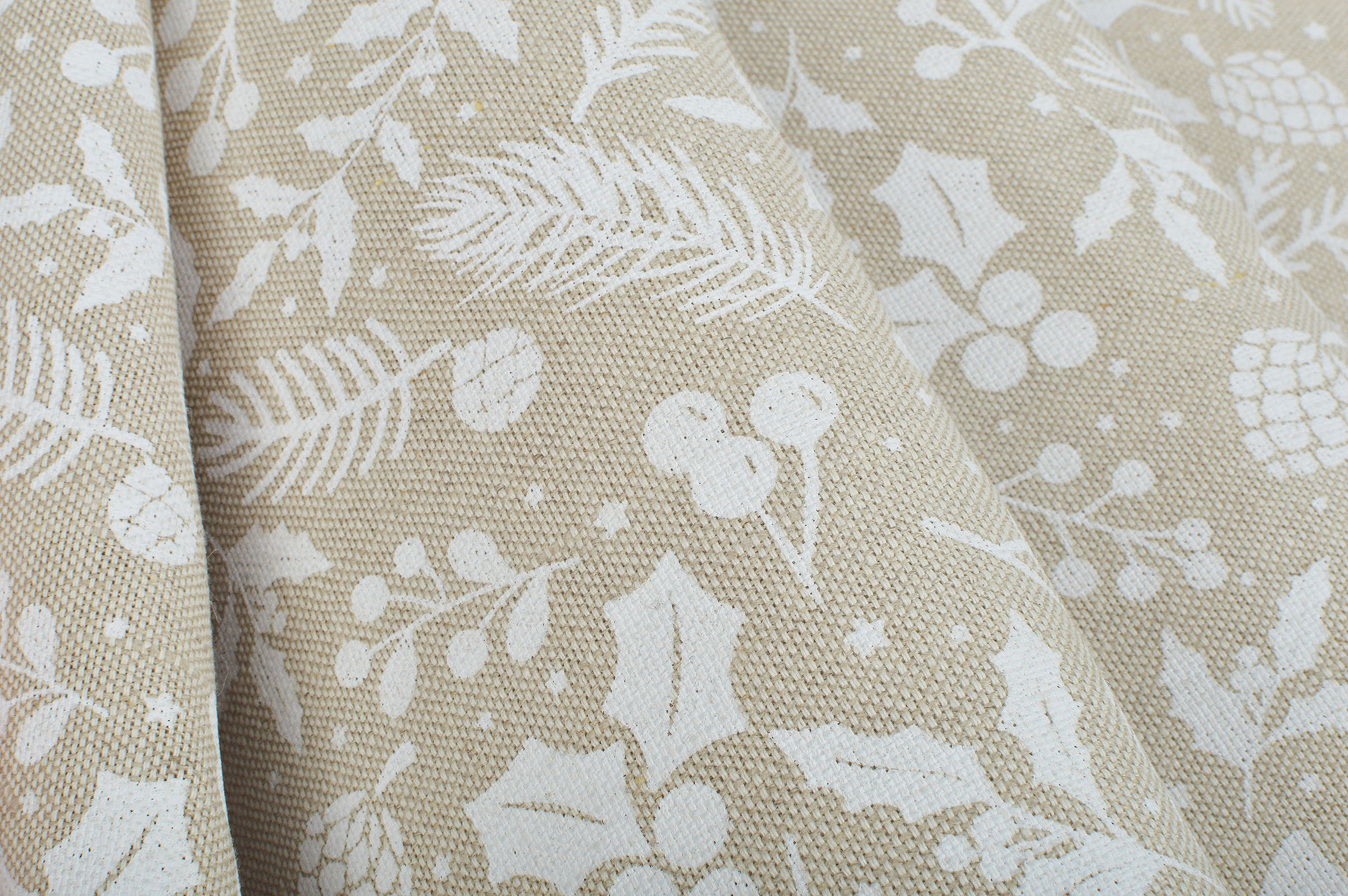 Puslininis audinys, margintas baltos spalvos stilizuotų Kalėdinių augalų motyvais. Audinys nėra minkštintas, todėl išlaiko natūralų, šiek tiek standesnį paviršių – idealų tekstilei, kuriai svarbi forma ir tvirtumas. Puikiai tinka virtuvės tekstilei, stalo gaminiams, namų dekoracijoms bei aksesuarams, kuriuose derinamas funkcionalumas ir estetinė išraiška.