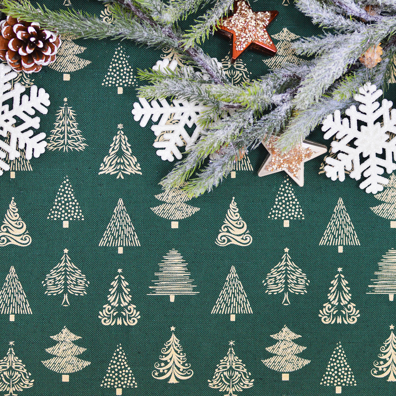 Puslininis audinys, margintas auksinės spalvos stilizuotų Kalėdinių eglučių motyvais.